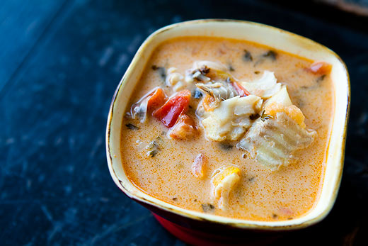 This is a nice simple soup that makes good use of a mixture of fish and shellfish or just shellfish. If you are using prawns and lobster then you can put the shells in the fish stock to beef it up a bit. Like most recipes, you can make it as spicy as you wish – the chilli quantity is up to you.